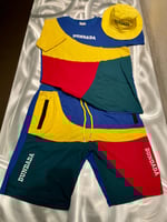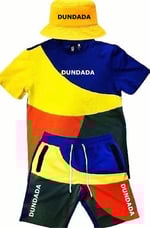 Multicolored short set with bucket hat. Fabric Colors: Yellow, Blue, Red and Green. Light weight cotton for the summer.